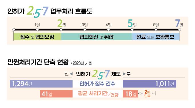 민원 신청 후 단 7일 이내에 법령검토와 관련 부서 간 협의를 거쳐 취합한 결과를 통보해주는 방식으로 간소화된 2.5.7의 성과는 눈부시다. 2023년 7월 시행 이래 1년동안 제도준수율은 99.7%에 달하며, 인허가처리 기간도 제도시행 전인 2023년 상반기 평균 41일에서 제도시행 후인 하반기 평균 18일로 57%나 단축된 결과를 보였다. 2.5.7을 직접 경험한 민원인을 대상으로 조사한 민원만족도 조사 결과도 10점 만점에 8.6점에 이른다.