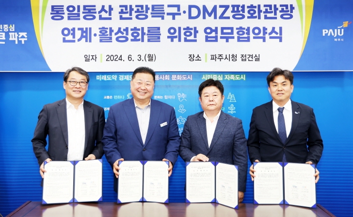 [뉴스서울] 파주시는 지난 3일 시청 접견실에서 ‘통일동산 관광특구·디엠지(DMZ)평화관광 연계·활성화를 위한 업무협약식’을 개최했다.