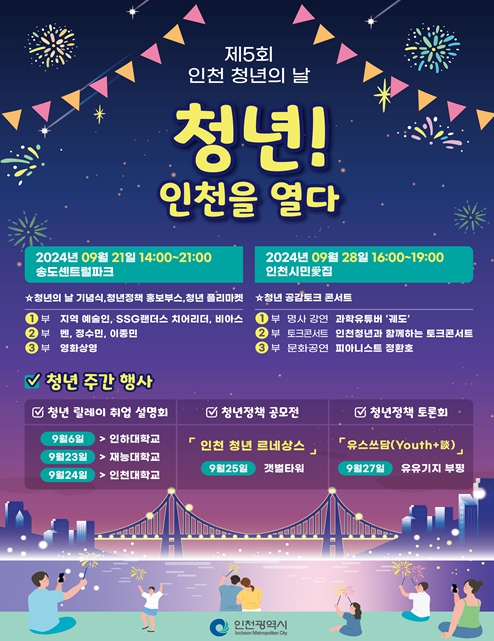 한편, 인천 청년주간(9월 21일 부터 28일) 동안 청년들의 창의력과 열정을 발휘하고 지역사회와 소통을 강화할 수 있는 다양한 행사가 진행된다.