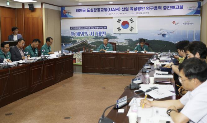 군은 지난 22일 군청 소회의실에서 가세로 군수 등 공직자와 군의원, 용역기관 관계자 및 자문위원 등 14명이 참석한 가운데 ‘태안군 도심항공교통(UAM) 산업 육성방안 연구용역 중간보고회’를 개최했다고 밝혔다.