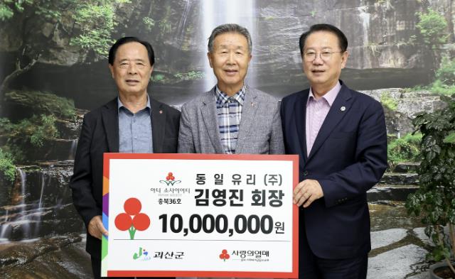 이날 기탁식에는 김영진 동일유리(주) 회장, 송인헌 괴산군수, 이민성 충북사회복지공동모금회장이 참석했다.