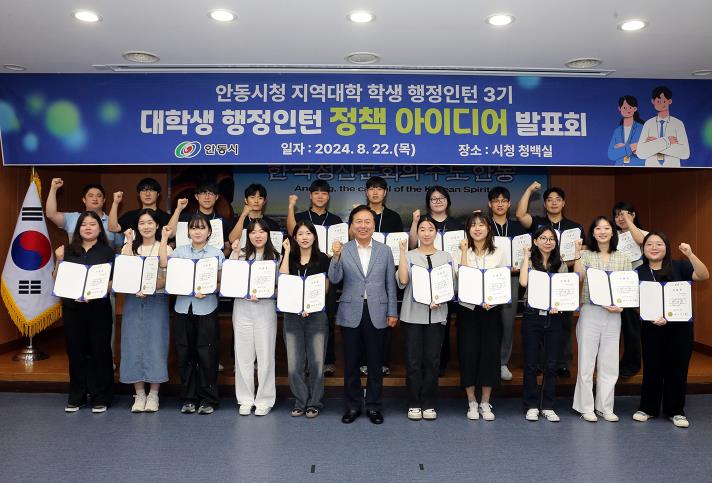 한편, 안동시는 지역대학 학생에게 직무 체험을 통해 사회생활 경험을 쌓을 기회를 제공하고 지역 정착을 유도하기 위해 행정인턴 사업을 운영하고 있으며, 이번 여름방학 행정인턴은 두 달간 시청 각 부서 및 관련 기관에 배치돼 근무했다.