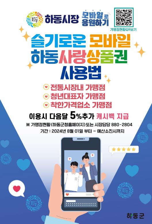 사업은 2024년 8월 1일부터 예산 소진 시까지 진행되며, 모바일 하동사랑상품권 가맹점 정보는 하동군 홈페이지 혹은 배부될 홍보물의 가맹점 현황 QR보기를 통해 확인할 수 있다.