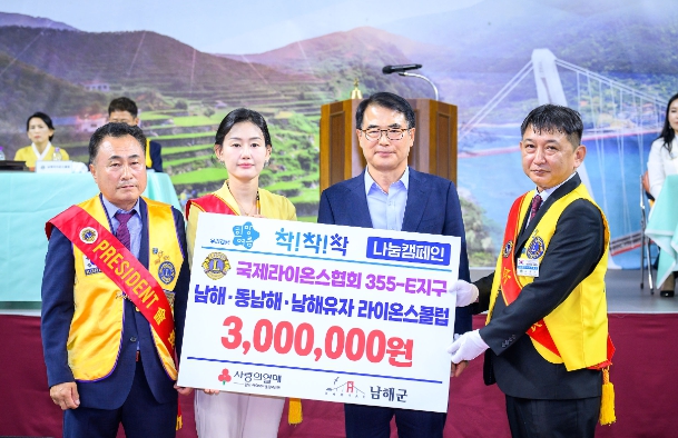 [뉴스서울] 남해군은 지난 5일 남해실내체육관에서 국제라이온스협회 355-E지구 남해·동남해·남해유자라이온스 합동 이·취임식이 열린 가운데 이들 단체에서 이웃돕기 성금 300만원을 기탁했다고 밝혔다.