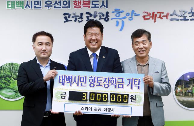 [뉴스서울] 스카이 관광 여행사는 지난 30일 지역인재육성을 위해 써달라며 태백시민향토장학회에 장학금 3백만 원을 기탁했다.