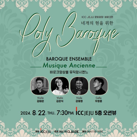 제주의 늦여름, ‘네 개의 현을 위한 Poly Broque’라는 주제로 열리는 이번 공연은 유럽과 한국에서 활동 중인 아티스트로 구성된 뮤직앙시엔느(Musique Ancienne)의 현악 4중주로 진행된다.