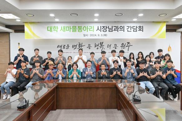 이날 원강수 시장과 대학생들은 봉사활동의 동기부여를 위한 다방면의 동아리 활동 지원과 더불어 대학생들의 주요 관심사인 취업, 교통, 문화·체육 시설 등 6개 분야에 대해 논의하고, 새마을동아리의 발전과 관내 대학생들이 원주에 정착하여 역량을 펼칠 수 있는 방향에 대해 깊은 대화를 나누었다.