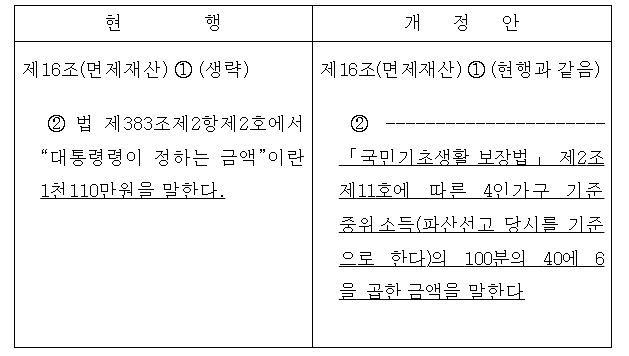 상한금액은 「국민기초생활 보장법」 제2조제11호에 따른 4인가구 기준 중위소득(파산선고 당시를 기준으로 한다)의 100분의 40에 6을 곱한 금액으로 규정했다(안 제16조 제2항).