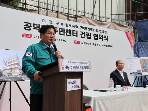 이날 공덕1구역 문경래 조합장은 협약에 이르게 된 배경에 대해 “공덕1구역 재건축사업은 마포구와 공덕동 주민들의 이해와 지원이 없었다면 불가능했다”라며 “공덕동과 마포구 발전에 책임감을 느끼고 보답하고 싶다고 생각하던 차에 박강수 마포구청장이 공덕동 신청사 건립에 힘을 쏟고 있는 것을 알고 조합이 힘을 보태게 됐다”라고 밝혀 큰 박수를 받았다.