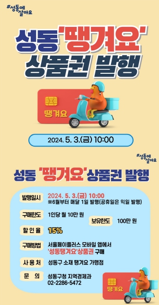 정원오 성동구청장은 “소상공인 매출 향상과 고물가 시대 가계 부담을 줄이는 데 도움이 되길 바란다”라며 “소상공인과 구민 모두에게 도움이 될 수 있도록 제도 운영에 최선을 다하겠다”라고 말했다.