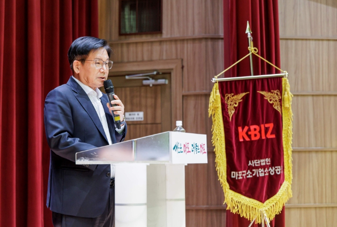 ▲ 마포구 소기업소상공인 2기 출범식에서 인사말을 나누는 박강수 마포구청장 |