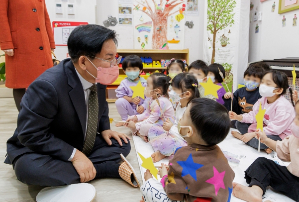 ▲ 박강수 마포구청장이 도란도란 어린이집 원아들에게 인사를 전하고 있다. |