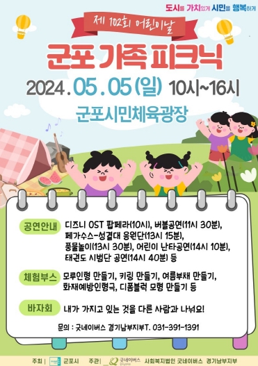 [뉴스서울] 군포시는 오는 5월 5일 어린이날에 2024 어린이날 행사 ‘군포 가족 피크닉’ 을 군포시민체육광장에서 개최한다.