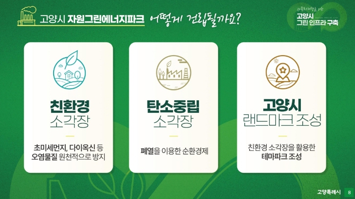고양시 관계자는 “객관적이고 합리적인 기준으로 최선의 자원그린에너지파크 후보지를 선정할 방침이다. 주민들의 필요를 반영한 편의시설. 깨끗한 친환경 기술과 엄격한 관리로 유치를 희망하는 기대시설로 조성할 계획”이라고 밝혔다.