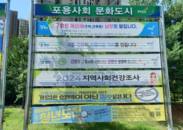 [뉴스서울] 파주시가 오는 9월부터 금촌과 운정신도시 중심 상권의 현수막 게시대 2기, 12면을 친환경 현수막 전용 게시대로 지정해 운영에 나선다. 친환경현수막 게첨 신청 접수는 8월 10일부터 시작된다.