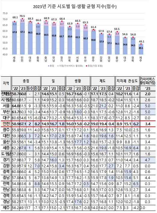 ▲ ‘23년 일·생활 균형 지수 지자체별 점수 |