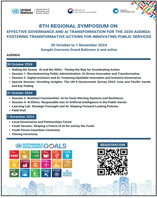 ‘인공지능(AI) 시대, 지속가능한 미래정부를 위한 글로벌 협력 논의’를 주제로 열리는 이번 심포지엄은, 유엔과 아시아·태평양 지역의 공공행정 전문가들이 유엔의 지속가능발전목표(Sustainable Development Goals) 이행 전략을 논의하기 위해 2017년부터 매년 개최되어 올해로 8회를 맞이했다.