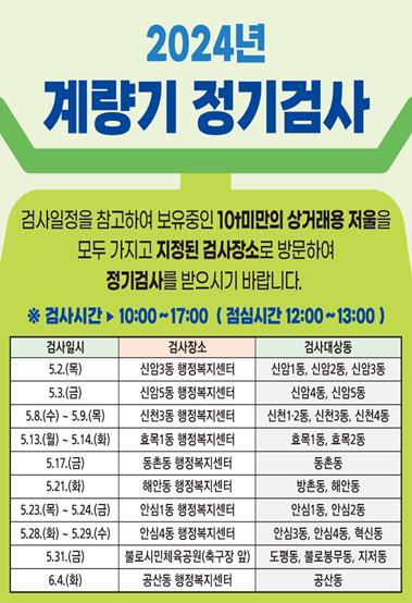 정육점, 대형마트, 쌀집, 수산시장, 식당, 전통시장 등에서 이용하는 저울은 모두 대상이며, 검사 일정을 참고해 해당 행정복지센터에 방문하면 된다.