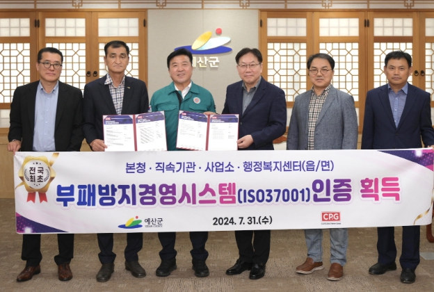 [뉴스서울] 예산군은 글로벌인증기관(JAS-ANZ호주등록)인 CPG인증원으로부터 군 전 부서(본청, 직속기관, 사업소 및 읍면행정복지센터)를 대상으로 약 2주간의 심사를 진행한 결과 부패방지경영시스템(ISO 37001) 인증을 획득했다고 밝혔다.