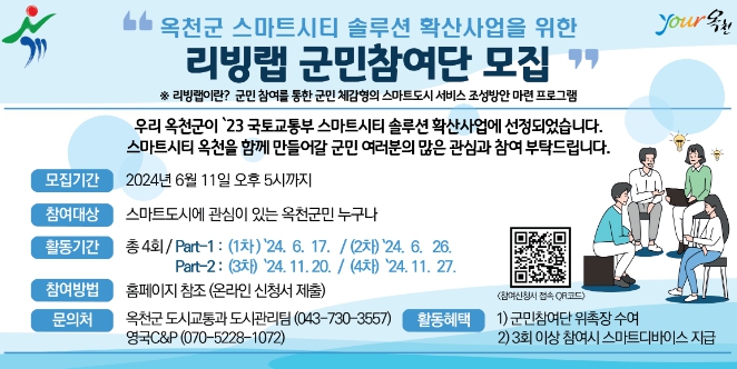 군민참여 리빙랩 참가 신청은 옥천군 누리집을 통해 할 수 있으며, 기타 궁금한 사항은 옥천군 도시교통과 또는 영국C·P로 문의하면 된다.