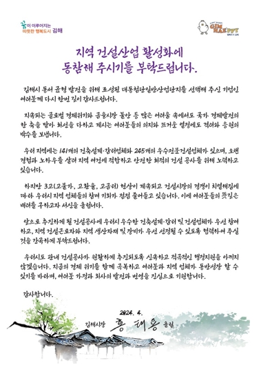 [뉴스서울] 김해시는 대동첨단일반산업단지 기업체에 시장 서한문을 발송해 지역 건설산업 여건 개선에 동참을 당부했다.