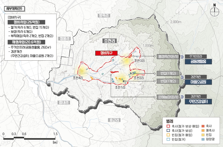 이러한 주민들의 요구를 반영해 사업대상지 내 돈사 2개소, 우사 4개소, 빈집 15개소를 철거하고, 공동생활홈, 주민건강쉼터, 마을 소공원을 조성해 주민의 삶의 질을 개선하고, 인구 유입을 유도하는 등 청안면의 농촌기능과 경관을 회복해 나갈 계획이다.