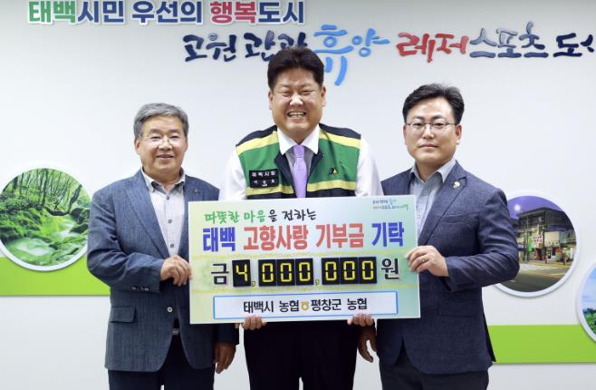 이번 상호기부는 태백시와 평창군 농협 임직원 77명이 동참하였으며, 두 시군의 화합뿐만 아니라 고향사랑기부제의 성공적인 정착에 대한 응원까지 더해져 더욱 특별한 의미를 담고 있다.