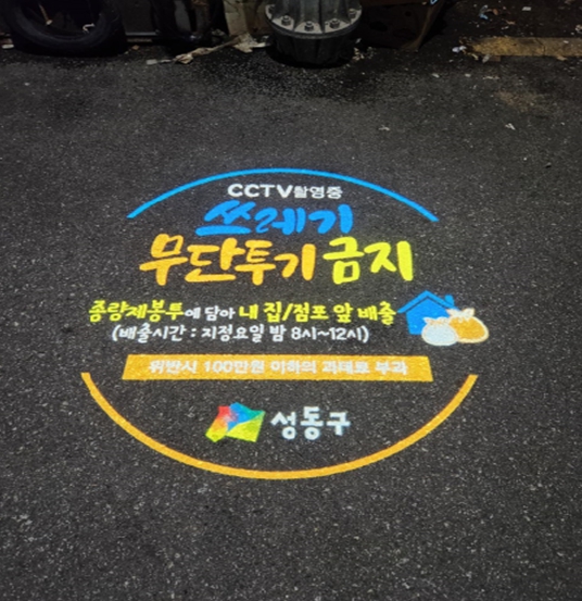 성동구는 현재 상습적인 무단투기가 발생하는 취약지역에 폐쇄회로 티브이(CCTV) 225대, 로고젝터 83대를 운영 중으로 매년 대수를 늘려 쓰레기 무단투기 예방 및 단속에 힘쓰고 있다.