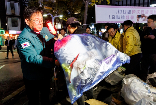 ▲ 지난해 10월, 핼러윈 인파밀집 안전관리 시 통행에 방해가 되는 쓰레기를 치우고 있는 박강수 마포구청장 |