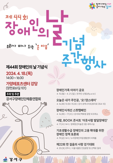 [뉴스서울] 서울 강서구가 오는 20일 44번째 장애인의 날을 기념해 장애인과 비장애인의 벽을 허무는 특별한 한 주를 마련했다.