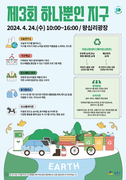 [뉴스서울] 서울 성동구가 오는 24일 오전 10시 왕십리광장에서 탄소중립 생활 실천 문화 확산을 위한 ‘제3회 하나뿐인 지구’ 행사를 개최한다.