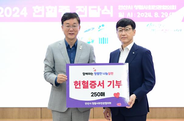 [뉴스서울] 안산시 청렴사회민관협의회는 지난 29일 시청 제1회의실에서 안산고려대학병원에 헌혈증 250매를 기부하는 자리를 마련했다고 30일 밝혔다.