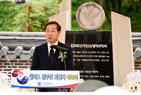 ▲ 유정복 인천광역시장이 2023년 9월 15일 중구 월미공원 월미도 원주민 희생자 위령비에서 |