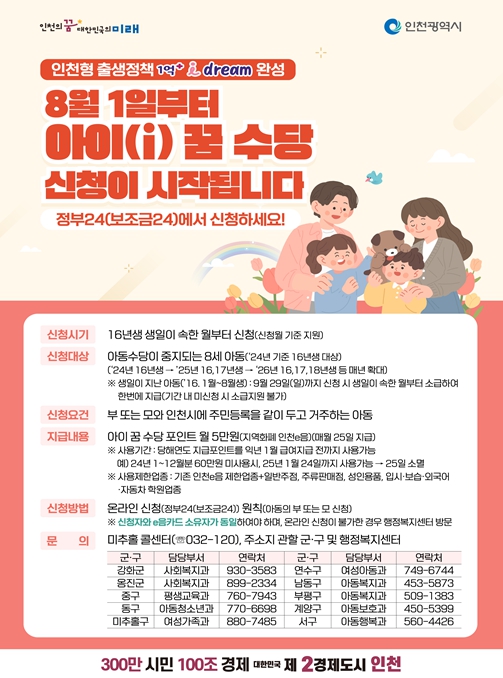 [뉴스서울] 인천광역시는 오는 8월 1일부터사업의 일환으로 추진되는 ‘아이 꿈 수당’의 신청·접수를 시작한다고 밝혔다.