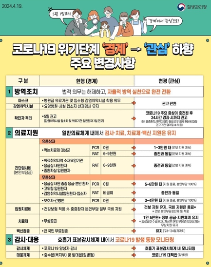 이번 하향 조정에 따라 방역조치, 의료지원, 감시·대응체계 부분이 변화된다.