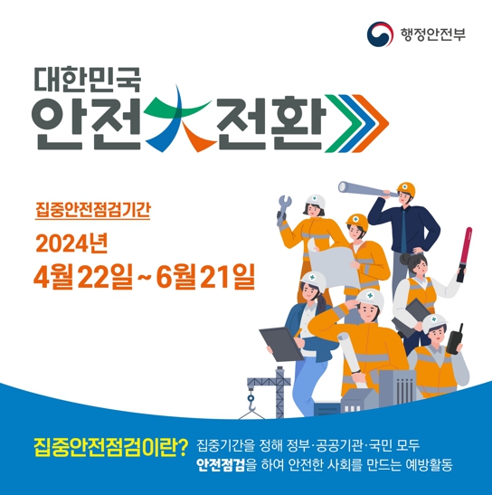 ‘대한민국 안전대(大)전환을 위한 집중안전점검’은 안전사회에 대한 국민적 요구가 증대됨에 따라 각종 시설물의 대대적인 점검 등 사회 전반의 안전 실태를 집중 점검하여 안전위험 요소를 사전에 제거하기 위함이다.