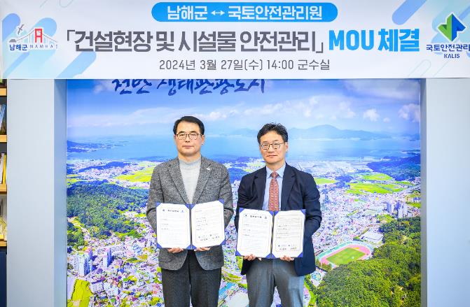 [뉴스서울] 남해군과 국토안전관리원은 27일 남해군청에서 ‘건설현장 및 시설물의 건설안전 확보를 위한 업무협약(MOU)’을 체결했다.