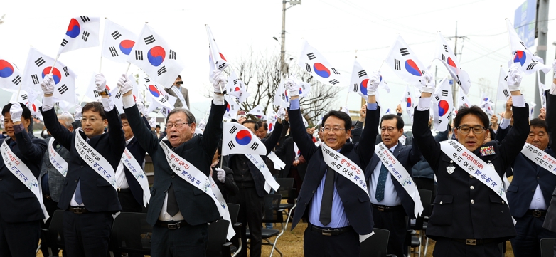 ▲ 기념식 참가자들이 ‘만세삼창’을 하고 있다. |