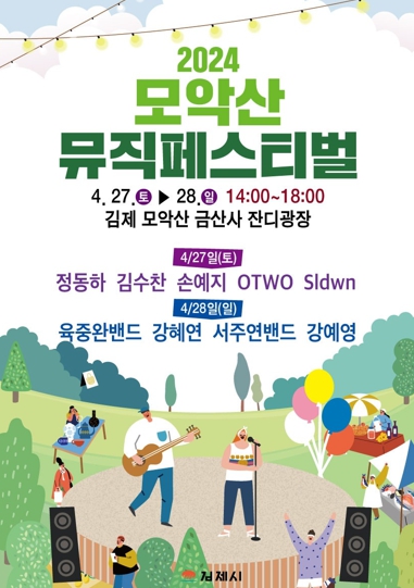 22일 시에 따르면 오는 27일과 28일 오후 2시부터 6시까지 김제 모악산 잔디광장(김제시 금산면 금산리 99-2) 일원에서 ‘2024 모악산 뮤직 페스티벌’이 열린다.