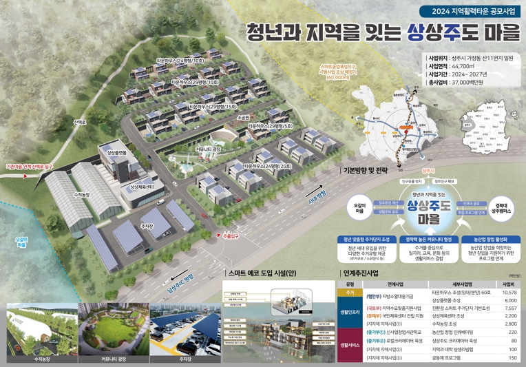 상주시 ‘청년과 지역을 잇는 상상주도’는 가장동 산11번지 일원 4만 4천7백㎡ 부지에 총사업비 370억원을 투입해 타운하우스 60호, 상상플랫폼, 상상체육센터, 수직농장(2동)을 조성한다.