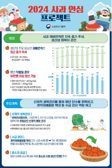지난해 봄철 냉해, 여름철 호우·탄저병 등 동시다발적 재해·병해충 피해로 주요 과일 생산량이 30% 내외로 감소했고, 이에 따라 가격 강세가 지속되고 있다. 작년과 같은 수급 불안이 반복될 수 있다는 국민들의 우려가 큰 상황에서, 소비 비중이 가장 큰 사과를 안정적으로 생산하기 위해 「2024 사과 안심 프로젝트」를 추진한다.
