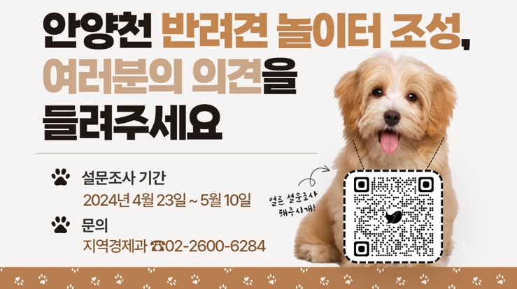 진교훈 구청장은 “반려견 놀이터는 필요한 시설이지만 위치 선정에 있어 주민들의 의견이 갈릴 수 있는 만큼 사업추진을 결정하기에 앞서 주민들의 의견을 듣고자 설문조사를 실시한다”라며 “설문조사에 참여해 소중한 의견 주시길 부탁드린다”라고 말했다.