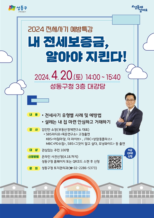 이번 특강은 전세사기 피해 예방에 관심 있는 누구나 들을 수 있으며, 참여를 원할 경우, 성동구청 누리집(새소식)을 통해 사전 신청하면 된다. 강의는 1시간 40분 동안 진행되며, 참가비는 무료다.