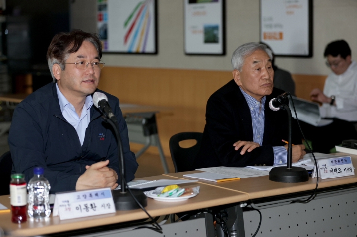 | ▲ 창릉천 용역 중간보고회에서 이동환 고양특례시장(좌), 이재오 자문위원장(우) |