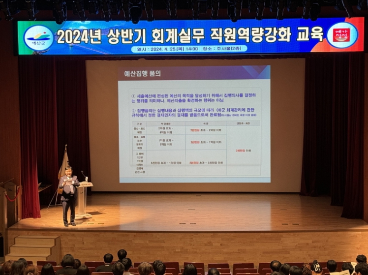 [뉴스서울] 예산군이 공정하고 투명한 회계 운영으로 군정의 효율성을 높이고 신뢰행정 구현에 기여하고자 지난 25일 군청 추사홀에서 직원 300명을 대상으로 2024년 상반기 회계실무 직원역량강화 교육을 실시했다.
