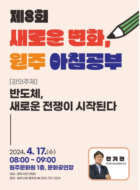 [뉴스서울] 원주시는 오는 17일 오전 8시부터 원주문화원 1층 문화공연장에서 '제8회 새로운 변화, 원주 아침공부'를 개최한다.