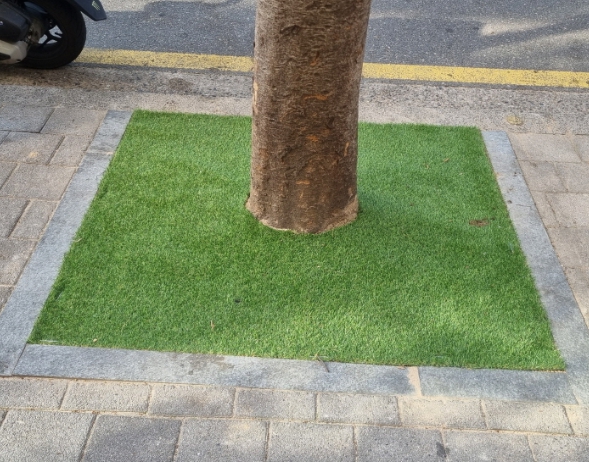 기존 가로수 뿌리가 보행을 방해하지 않도록 마사로 평탄화한 뒤 그 위에 인조잔디를 설치하고 고정핀을 꽂아 보호덮개 이탈을 방지했다.
