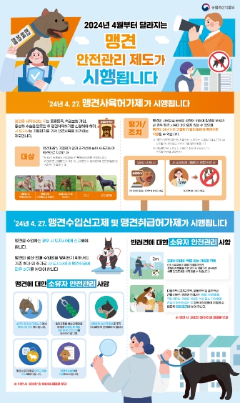 [뉴스서울] 농림축산식품부는 맹견사육허가제, 반려동물 행동지도사 국가자격제, 동물복지축산 인증 등 「동물보호법」 개정 사항이 올해 4월 27일부터 시행된다고 밝혔으며, 새롭게 시행되는 내용은 다음과 같다.