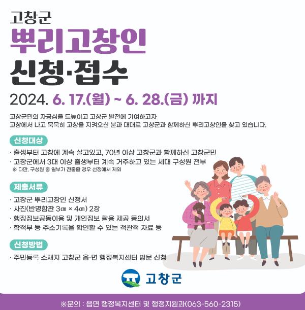 뿌리고창인 신청대상은 70년 이상 출생부터 고창에 계속 살고 있거나 3대 이상 출생부터 계속해서 거주하고 있는 세대 구성원이다.
