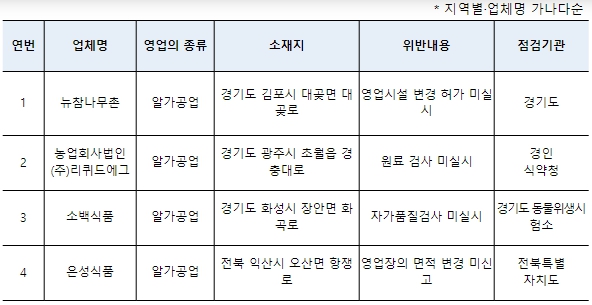 위생점검 결과 주요 위반내용은 ▲영업시설 무단 변경(2곳) ▲자가품질검사 미실시(1곳) ▲원료 검사 미실시(1곳)이며 위반업체에 대해서는 관할 지자체가 행정처분 후 6개월 이내에 다시 점검해 개선 여부를 확인할 계획이다.